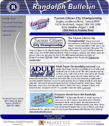 Randolph has taken this a step further. We now offer our patrons an email bulletin. They can simply submit their email address on our website and they will be immediately entered into our database and begin receiving bulletins with Tournament Alerts. We?ve made it so easy that people don’t even have to remember the events anymore! They can click right on the email and it will send them to online registration.
